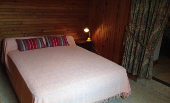 A bedroom with 1 double bed, separated from the living room by an arch and a curtain.