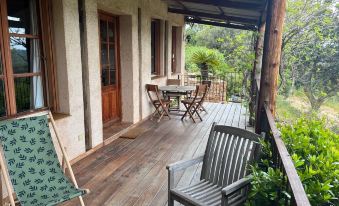 Das Haus liegt mitten im Grünen an einem Südosthang; von der sehr schönen Veranda aus kann man weit blicken über die Macchia; man sieht eigentlich nur ein einziges anderes Haus und sonst nur Grün. Der Wohnbereich (essen, kochen, schlafen) besteht aus einem sehr großen Zimmer. Wer hitzeempfindlich ist und im Hochsommer anreist, sollte bedenken, dass es zwar zwei Ventilatoren, aber keine Klimaanlage gibt. Die Ausstattung des Hauses hat uns voll zufriedengestellt. Die Lage in der Nähe der Straße Ospedale - Porto Vecchio ist recht praktisch, da man einerseits leicht ins gebirgige Landesinnere und andererseits recht zügig nach Porto Vecchio kommt. Dass unsere Anreise sehr spät abends erfolgte, stellte erfreulicherweise kein Problem dar.
