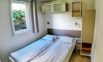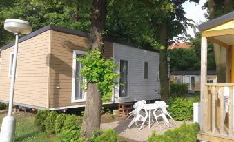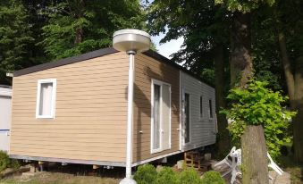 Praha/Dolní Počernice: Child friendly, cosy holiday village "Camping Sokol", surrounded by trees. On the outskirts, in a sunny position, 100 m from the lake, in the countryside. For shared use: property (fenced), swimming pool (15 x 8 m, seasonal availability: 11.May. - 07.Sep.). Children's pool, children's playground. In the complex: reception, restaurant, WiFi, table tennis, trampoline, shopping facilities. Parking at the house. Shop, grocery 10 m, supermarket 1 km, shopping centre 6 km, restaurant 10 m, bus stop "Škola Dolní Počernice" 200 m, railway station "Dolní Počernice" 1 km, bathing lake "Počernický rybník" 100 m. Golf course (18 hole) 2 km, tennis 5 km. Please note: entertainment in the season. Baby equipment (extra). "Hawaii Style", 4-room mobile home 37 m2. Living room with 1 sofabed and dining table. 2 rooms, each room with 1 double bed. 1 room with 2 beds. Kitchen (4 gas rings, microwave, freezer, electric coffee machine). Shower, sep. WC. Electric heating. Terrace. Terrace furniture. Facilities: Internet (WiFi, free). Suitable for families. Maximum 1 pet/ dog allowed.