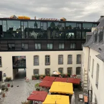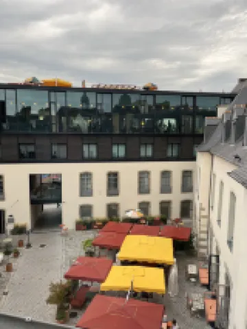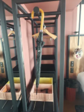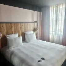 Hôtel est vraiment centre vieille ville de Rennes. Bien situé pour les balades à pieds. Stationnement facilité par un parking souterrain payant 24/24 et 7/7. Attention car tous les samedis se tient le marché sur la place des Lices. Après le passage dans une cour intérieure qui sert aussi de lieu tranquille où vous pourrez consommer des boissons, vous accéderez au desk d'enregistrement. Accueil parfaitement professionnel façon Mama Shelter. La chambre est grande aux coloris modernes. Présence d'un parapluie, ça peut servir en Bretagne mais absence de café ou thé ou boisson chaude mis a disposition. Présence mini frigo avec 2 bouteilles d'eau et coffre fort. Prévoir une caution de 50 euros par jour de présence débitée immédiatement et remboursable sous quelques jours après votre départ .