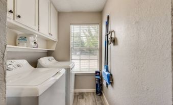 This cozy 2 bedroom home sleeps 5 and is equipped with everything you need for a comfortable and convenient stay including a washer & dryer, fully stocked kitchen & bathroom, internet access, 45” Smart TV in the living room as well as books and games to enjoy during your time here. Each bedroom holds a queen bed, a Smart TV and large closet space with hangers and a dresser. A twin size roll away style bed is provided for a 5th guest in the master bedroom. The kitchen provides a 4-burner range/oven, full size refrigerator with ice maker, microwave, Keurig coffee maker with coffee, plenty of cookware, dishes & flatware.