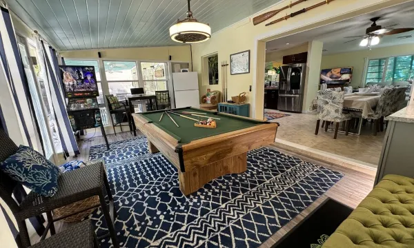 • Game room with regulation pool table, pinball arcade, and wet bar