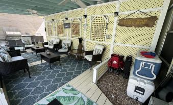 • Tiki-themed covered patio with seating, ceiling fans for shade