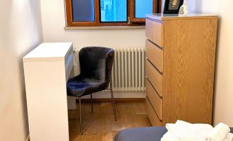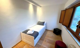 Exclusive and private, it has a Single-size bed, a large dedicated chest of drawers and a workspace with a desk and upholstered chair, plus views of the large condominium courtyard and direct entrance from the living room.
