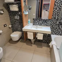 New hotel. A bit far from city. Nice TV, Breakfast, Bed. Bath tub with movable glass screen, a bit slippery. I fell when I was bathing.