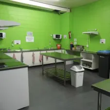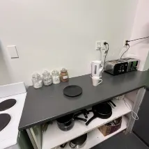 Have kitchen with fridges, microwaves, stoves , utensils, pans , cleaning soap…… paid washing machines.