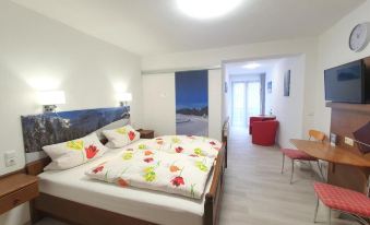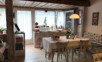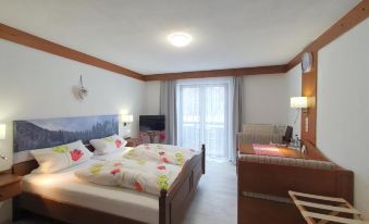 Siamo stati casualmente in questa amena località e abbiamo trovato x caso (su internet) la struttura: Camera dal soffitto un po' basso (tipo mansarda) ma comunque soddisfacente: pittoresco l'armadio, bello il balconcino con vista monti, x prendere il sole e farsi una fumatina...Bagno però non solo senza finestra ma senza adeguata aerazione! Anche gli asciugamani lasciavano un po' a desiderare. ..Colazione.sufficiente anche se non abbondava x dolci e con cornetti limitati e yogourt scarso...La proprietaria poi non era il massimo della simpatia: per avergli chiesto del limone x tè...sembrava averle fatto un offesa! Averle chiesto uova scrambled poi...ha causato reazioni scostanti..(e con noi c'era una ragazza che parlava perfettamente tedesco) Probabilmente non gli eravamo simpatici inquanto italiani: con gli altri ospiti era gentile! Il suo "aiutante" era invece disponibile e più cortese. Anche il prezzo (120 euro a camera) non è stato a mio avviso, consono al serizio e alla camera.