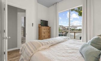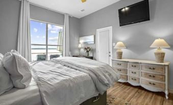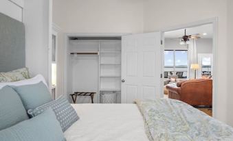 The private, primary king bedroom with direct covered patio access offers lake views and an en-suite bathroom with a double sink vanity, separate walk-in shower and jetted spa tub. Guests have plenty of storage space in a large walk-in closet and six-drawer dresser. A writing desk and chair are provided for those not able to disengage from work responsibilities.