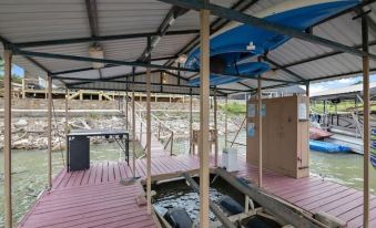 Start the day with fresh coffee on the 600 sq ft deck that stretches the length of the home with panoramic lake views, multiple covered & uncovered seating areas, including three single chaise chairs for sunbathing. Head down to your covered dock for fishing, swimming or other lake activities. Bring your own boat for sun-kissed afternoons on the lake; end the day with ease as you tie off. Two swing chairs, a kayak & paddle board provided. Make use of the propane grill and cookout. End perfect vacation days roasting marshmallows around the wood-burning firepit. Wood not provided.
