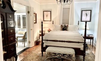 The bathroom has 6 foot marble walls, adjustable wall makeup mirror, hand painted chinoiserie stenciling above the marble, first aid kit, toiletries and a walk-in marble shower with hand held sprayer. The bathroom is located between the two bedrooms. Each bedroom has a queen size bed, a highboy for clothes, bedside Waterford crystal lamps, a fan with remote control, robes, extra sheets, pillows and blankets, a sewing kit (front bedroom), full size dressing mirror, iron with ironing board and hangers.