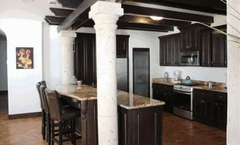Enjoy the common areas that encourage comfortable, festive gatherings and offer panoramic views of the sea. Relax in the spacious living room that accommodates a large party under a brick ceiling dome. The gourmet kitchen is generous with ample room for the evening’s chef to prepare a banquet. Top of line appliances, walk-in pantry, fully equipped kitchen allow for unlimited possibilities. If you prefer dining al fresco, the roof terrace has a complete outdoor kitchen with a four-burner gas grill, separate food warmer and a sink for easy cleanup. You supply the “catch of the day”; everything else is provided for you. The dining room is equal in class, furnishings and ocean views...the big square onyx table is made for festive gatherings and fresh food. We even have a cook available that can take care of any size gathering.