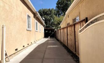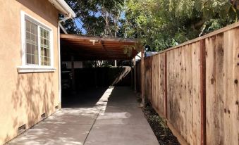 The whole backyard is covered with concrete and 12 feet roof. Covered carport in front of the front unit door for your convenience. You will never get wet to get to/from the car from/to the house.