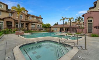 Welcome to your home away from home! This home is designed for comfort but fit for your busy needs. With two bedrooms, two full bathrooms upstairs, we can accommodate up to 4 people but you can host many more. Step out to the cute and breezy balcony and discover an elevated living experience. Head downstairs to discover a large family park with play structure, BBQ grills, and neighborhood cheer. Cool off in the pool or let loose in the hot tub!