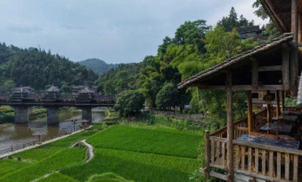 Nestled on a hillside by the iconic Chengyang Wind-and-Rain Bridge, this century-old Dong wooden stilt house whispers with bamboo groves. Only 4 family suites (35㎡ each) blend aged timber and Dong textiles, framing views of mist-draped bridges at dawn and moonlit Drum Towers by night. Soundproofed walls mute the world, leaving room for mountain breezes and cicada songs.