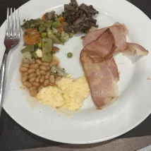 La chambre était bien sauf qu'elle avait vue sur les parkings. Il y avait du shampoing, du savon, de la corde, des pantoufles, du fer à repasser et une cafetière. Pas de sachets de thé. Le lit et les oreillers étaient très confortables. Le petit déjeuner était juste correct. Les œufs brouillés et le côté ensoleillé étaient froids. Mauvaise variété de pain. Dans l'ensemble c'était ok
