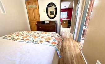 This vacation rental is one of our most popular casitas. With two bedrooms and two baths, it'll make a family vacation come true! (approx. 950 square feet) Both bedrooms have queen-size beds, and there is also a queen-size pull-out sofa in the den, making it perfect for families up to six! The kitchen has a small dining room table for four people, plus a breakfast bar with two bar stools. The living area and kitchen spill into one another, making it easy to visit with one another. It has all the authentic touches -- a kiva fireplace, saltillo tile, and hardwood floors. But it has also been skillfully updated to provide you with all the modern conveniences, including cable TV, laundry facilities, a full kitchen, air conditioning, and complimentary high-speed Internet access. This casita boasts a large enclosed patio that is ideal for an outdoor evening on a mild summer night. This is our only casita that is not pet-friendly. We do not allow pets in here and try to keep it especially for those with severe