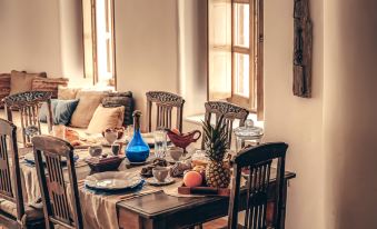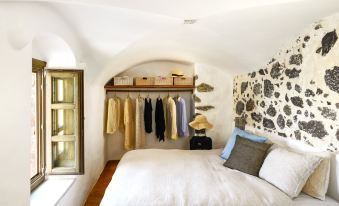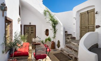 Les intérieurs sont agrémentés d'un mobilier cycladique Belle Époque original et d'une esthétique vintage classique, créant une atmosphère de raffinement noble. Le salon respire la grâce du passé architectural de Santorin, tandis que l'ambiance ensoleillée et accueillante assure un séjour empreint de chaleur et de calme.