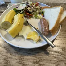 Le petit-déjeuner est une portion fixe, et vraiment minuscule. Le nôtre se composait de deux petits morceaux de pain triangulaires, une saucisse, un œuf, quelques légumes et une orange.