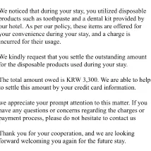 Des frais de chambre aussi élevés nécessitent des frais supplémentaires pour les articles de toilette. Bien que le prix ne soit pas cher, je n'ai pas été informé des frais supplémentaires lors de l'enregistrement ! Aucune question n'a été posée lors du départ, et s'il y avait des frais, veuillez ne pas le mettre sur l'évier, ce qui a fait penser à tort aux invités qu'il pouvait être utilisé normalement ! La caution est tellement chère. Quand j'étais le plus sans voix, j'ai envoyé un e-mail après le départ pour vous dire qu'il y avait des frais ! Pas de bons sentiments du tout !