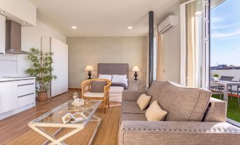 Beautiful designer penthouse studio, furnished to a high standard, offering a modern, functional, and cozy space. The apartment features a comfortable living and seating area, a fully equipped kitchen, an open sleeping area with a double bed, and a separate full bathroom.