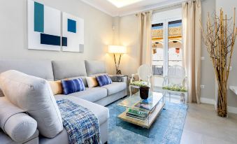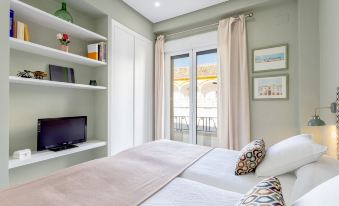 Upon entering the apartment we find a hall that give access to a fully equipped bathroom with shower, and the living room, which has an L-shaped sofa that is also a sofa-bed, and a dining area. From there we go out to the balcony, where we can enjoy privileged views of the Maestranza bullring, and gives the room a great natural light.
