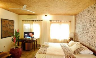 Cet établissement est situé au sud de yogyakarta. Les chambres sont très spacieuses et c'est la première fois que nous dormons dans un lit extra extra large. Le cadre est végétal et magnifique. Nous avons accès à une petite piscine par ses dimensions mais agréable pour se rafraîchir. Il y a la climatisation dans les chambres. Il y a le WiFi. Le personnel est très accueillant et disponible. Nous avons testé les massages à 13 € pour 1 heure. Les massages sont super toniques ! Profitez en à Java car à Bali, c'est deux fois plus cher ! La cuisine de l'hôtel est bonne et à des tarifs raisonnables. Le seul hic, c'est que l'hôtel est situé sous un minaret. Pour la prière du matin, nous nous trouvons aux premières loges d'abord à 3h30 jusqu'à 5 h en discontinu. En plus y a 3 à 4 mosquées tout autour. C'est pour ça que des bouchons d'oreilles sont proposés par l'hôtel...