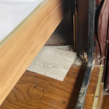 2. Mauvaise hygiène : poussière sous le lit, peinture murale écaillée, beaucoup d'eau dans la théière sur la table et des bouts de papier dans la tasse.