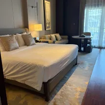 Les chambres de l'hôtel sont également pittoresques et bien équipées. Les armoires comprennent un coffre-fort, des peignoirs, un sèche-cheveux Dyson, une machine à café à capsules et du thé noir et vert au bar à eau, ainsi qu'un mini-réfrigérateur rempli de cinq ou six boissons gratuites et d'une bière. Les articles de toilette étaient confortables et abondants, et les poils de la brosse à dents étaient fins et doux, rendant le brossage des dents agréable. Nous avons même reçu des fruits et des viennoiseries l'après-midi de notre arrivée.