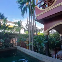 Un employé de l'hôtel, qui conduisait également un tuk-tuk, a proposé ses services, accepté pour 1 jour, ce que nous avons regretté plus tard - il conduit très bien un lévrier (nous sommes allés au village sur l'eau - gardez à l'esprit où ils emmènent tout le monde - ce n'est pas un village flottant, mais un village stationnaire sur le rivage). Comme on dit, nous transportons le bois de chauffage avec plus de précautions que les passagers ; sur la route du village, il y a 1238 bosses)))). Les premiers jours, nous avons voyagé dans un tuk-tuk pré-réservé par télégramme - il y a quelque chose à comparer. L'emplacement de l'hôtel n'est pas mal, l'hôtel lui-même est situé à l'écart de la rue, ce qui le rend calme, il y a une rue à 100 mètres et plusieurs cafés proposant de la cuisine de rue de l'autre côté du restaurant. Il y a une école à proximité, où les cours commencent, généralement par le chant à 6-7 heures du matin, ils chantent magnifiquement. Windows en est une parodie, parce que... les bâtiments sont situés à une distance de 2 à 5 mètres des fenêtres. De nombreux résidents locaux séjournent à l'hôtel et les familles du personnel de service vivent également (à ce que nous comprenons), leurs enfants visitent souvent la piscine. Cela ne nous a pas dérangés... L'eau de la piscine est fraîche. À propos du service lui-même, je l'ai aimé. La chambre avait également une bouilloire, des tasses, du café et du thé. La chambre avait ses propres toilettes et douche.