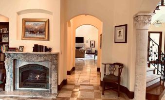As soon as you enter the grand foyer of this 6400 square foot home, you will be overwhelmed by the soaring ceilings, stone floors and gorgeous detail. The rooms all open to French doors and balconies leading to many areas to enjoy, both inside and outdoors. Lush gardens with stone pathways and walls adorn the grounds. Take a book and sit in the library by the fireplace or wander outside to read by the sound of the fountain.