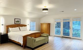 Renovated enchanting 1920's 4 bdrm, 1 Studio, 3 bath farmhouse on park like setting with gorgeous redwood trees. Open floor plan - family room/dining area combo w/fireplace - living room with formal dining area. 2 bdrms upstairs (one queen bed in one, two twins in the other that can be pushed together for a queen) plus spacious master-suite (one king size bed) w/ a balcony overlooking backyard, large tub with & stall shower. 1 bdrm downstairs (queen size bed) w/ a full bath. The studio has a day bed. There is a pull out couch and an inflatable mattress available if needed. Lovely yard w/ 2 decks one covered, patio, & front porch. Outdoor living, a spectacular outdoor gas burning fire pit, fountain, commercial grade BBQ and outdoor speakers. TOT 1120N.