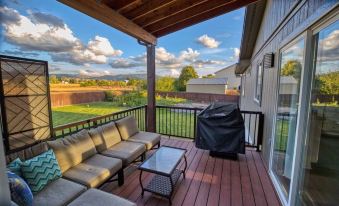 Beautiful view of the mountains off the covered patio with comfy seating and water feature below. Please note, our property does not have backyard access but has a great grassy front yard!