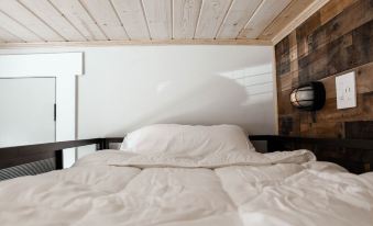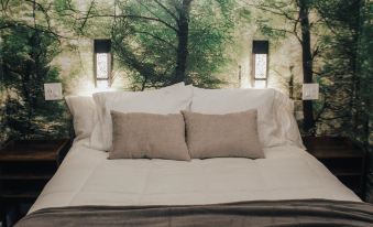 Bedroom #1- "The tree room" Offers a High quality Queen Mattress, linens and 30" inch smart TV. Unique features include dimmable vine lights, vines hanging from the ceiling, a massive forest mural on the wall and Red cedar wood ceiling. Each side of the bed is equipped with a personal night time sconce and outlet with USB's