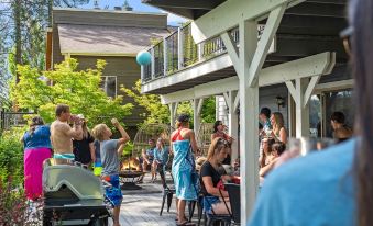 If you're craving al fresco dining, just head out the sliding door to the (larger) lower deck. Here, you'll find a spacious outdoor dining table that accommodates up to 12 guests, perfect for enjoying meals together amidst the serene natural surroundings. The lower deck also features the hot tub, a covered wood fire pit, and modern egg chairs, inviting you to cozy up and share stories as the night unfolds. Indulge in a soothing soak in the hot tub, grill up a delectable feast on the propane BBQ, and revel in the joys of outdoor hosting at its finest.