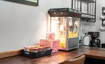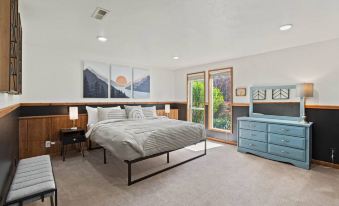 Near the front door is also a staircase. Downstairs, you'll continue to find incredible amenities and things to do! The room with the sliding door has a queen-size murphy bed available for guest use and a sleeper sofa that folds into a single bed. And just through the double doors, you'll discover the ultimate game room! A full size pool table, sectional sofa for lounging, smart TV, dart board, and board games. This room also boasts a wet bar with glass-like acrylic cups, and a popcorn maker with different seasonings to tantalize your tastebuds! Past the game room, the first bedroom has a queen bed with dresser and closet for clothes, with an additional storage closet with a folding poker table available for play! Also down this hallway, there's a second bedroom with cozy king size bed with dresser and closet for clothes storage, and a shared bathroom with walk-in shower.