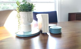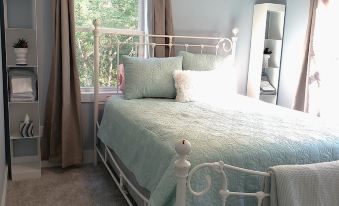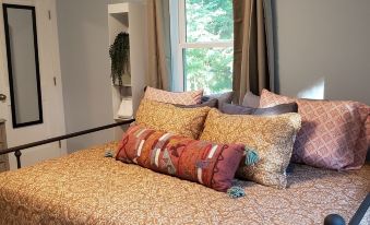 Just a stone's throw from St. Mary's College, our fully renovated cottage provides a light, modern, and cozy atmosphere. The open concept design is complemented by unique touches in each of the three bedrooms, making every space inviting. On the main floor, find a versatile bedroom with a queen bed and full-size trundle, complete with direct bathroom access. Upstairs, two more bedrooms offer lush tree views and queen or king-size comfort, alongside a shared bathroom. Blackout curtains in each room allow for restful sleep-ins or bright mornings.