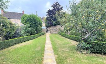 The garden lies in front of the house surrounded by high Cotswold dry stone walls. There is a patio with 2 tables and seating for 9, an area of lawn and a long stone path leading to the front gate and parking area.