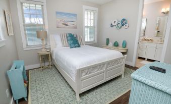 The light and bright en suite upstairs King master bedroom with stand-up double rain showerhead and soaker tub are set-up so you can enjoy a book and relax at the end of a fun filled day at the beach. Your master of masters allows you to walk out to a private balcony that faces you to a partial oceanview. With the calm sounds of waves crashing in the background, cool breeze kissing your skin, and a refreshing beverage in hand you’ll wish you never had to leave Footprints in the Sand.