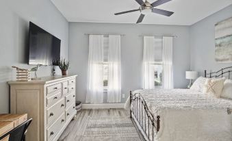 A craftsman-style bungalow with high-end finishes throughout including marble & tile floors, granite countertops and stainless appliances. Beautiful coastal decor and high-quality linens are the perfect complement to create an inviting and comfortable stay. The bedrooms each have TVs, ceiling fans, large closets, dressers and blackout shades for sleeping in or afternoon naps!