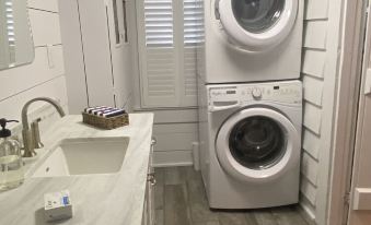 This is a true one bedroom home with an open concept living and kitchen area and full bath with washer and dryer. The living room features a pull out sofa with a queen size memory foam mattress. The bedroom includes a king size bed and dressing area with a lighted make-up mirror. High-end appliances compliment the kitchen and eating area for those who like to cook and eat in.