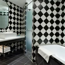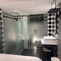 Nous avons choisi une chambre double sans fenêtre. Comme le montre la photo, la chambre est petite et les deux lits sont reliés entre eux, mais elle a tout, y compris une baignoire avec des zones sèches et humides séparées.