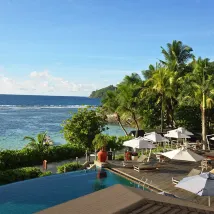 Отель расположен на берегу океана с видом на рассвет. Небольшая но очень уютная и красивая территория утопающая в зелени. К услугам гостей пейзажный бассейн с теплой водой. Роскошный пляж с довольно выраженными приливами и отливами. На пляже мягкий песочек и стелящиеся пальмы. Он со всех сторон окружен красивыми камнями. Лежаки и пляжные полотенца входят в стоимость. Полотенца в свободном доступе.