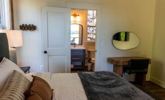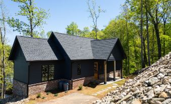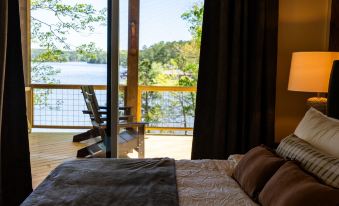 Retreat to the comfort of our primary bedroom, where luxury meets tranquility. Drift off to sleep on the plush king bed, surrounded by soft linens and tranquil vibes. Wake up to breathtaking views of the lake through the expansive windows or step out onto the porch through the sliding glass door for a closer look at nature's beauty. The en-suite bathroom offers convenience and privacy, complete with all the amenities you need for a refreshing start to your day. With serene views and cozy comforts, our primary bedroom provides the perfect sanctuary for rest and relaxation during your lakeside escape.