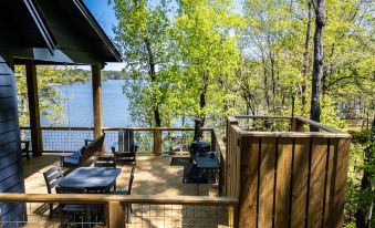 Step outside onto the covered porch and experience outdoor living at its finest, with a dining area for meals, relaxing chairs to soak in the scenery, and an outdoor shower area for a refreshing rinse after a day of lakeside adventures. Elevated among the treetops, our outdoor space provides a true connection to nature, where you can bask in the tranquility and marvel at the breathtaking lake vistas. As night falls, gather around the chiminea fire pit on the deck, where the crackling flames create the perfect ambiance for cozy evenings under the stars.