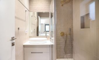 The bedroom features a plush, comfortable bed and soft lighting, creating a peaceful retreat for restful nights. The modern bathroom includes a walk-in shower and a hairdryer to ensure your stay is as comfortable as possible.