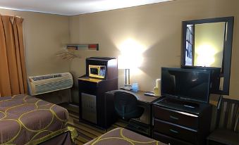 Hooters and Burger King are within walking distance for food. Our room still had trash and an unswept floor. The king size bed was on a bed frame but also had 2x4’s holding it up. The toilet felt like it was falling out of the floor and the flush lever was bone and had to be messed with to flush. Could use a make over or upgrade for sure.