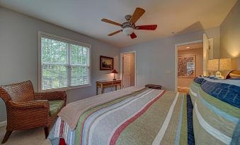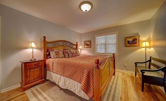 The "grandparents suite" is an elevated carriage house connected by covered walkway off the main house porch. It is a 1 queen bedroom/1 bath unit featuring high ceilings, warm wood finishes, and a place for respite from all the memories they are sure to be making. Features a living room with tv, couch, and seating. Kitchenette with table, coffee maker, full size stove, microwave, fridge, and full size sink. Bathroom with stand-up shower and double vanity. And their own thermostat!