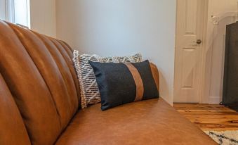 As you step inside, you'll be greeted by a beautiful foyer with a floral-printed wall and modern wood flooring. Relax in the living room on a stylish leather couch, read, or binge-watch your favorite shows on the SMART TV preloaded with Firestick.