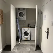 In room washer dryer dish washer good air conditioning fridge wine glasses pots stoves etc made my stay convenient and comfortable. Very friendly staff and helpful. Quiet and convenient location to get around by uber. Will highly recommend