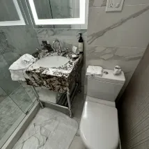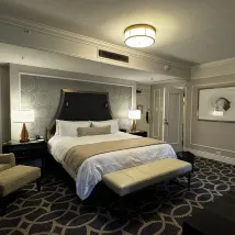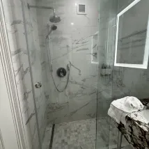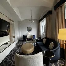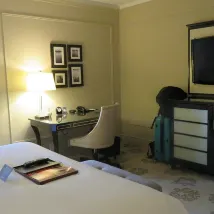 La suite, qui coûtait près de mille dollars la nuit, comprenait en fait une chambre à coucher et, plus loin, un salon. On aurait dit un balcon aménagé. La petite salle de bain n'avait pas de baignoire et il était difficile pour les personnes en surpoids de se retourner. Elle se verrouillait également toute seule pour des raisons inconnues. J'ai dû demander à la réception d'envoyer quelqu'un pour la réparer au milieu de la nuit, mais personne ne répondait au téléphone, j'ai donc dû descendre à la réception pour demander, ce qui était une véritable déception.